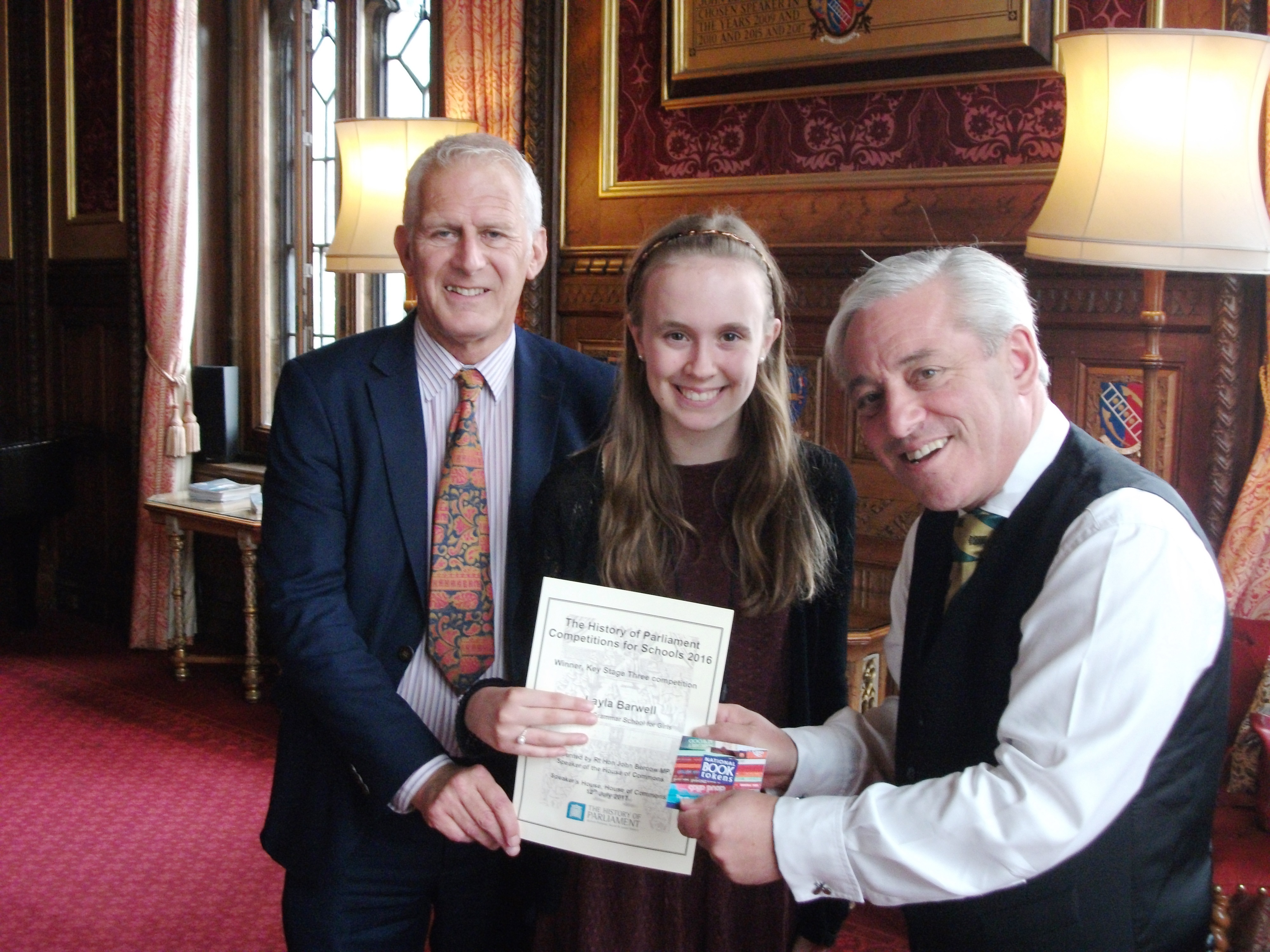 We then moved to Speaker’s House for Layla’s prize giving, presented by the Speaker, John Bercow, and our Chair of Trustees, Gordon Marsden MP. Layla also received a book token worth £75.