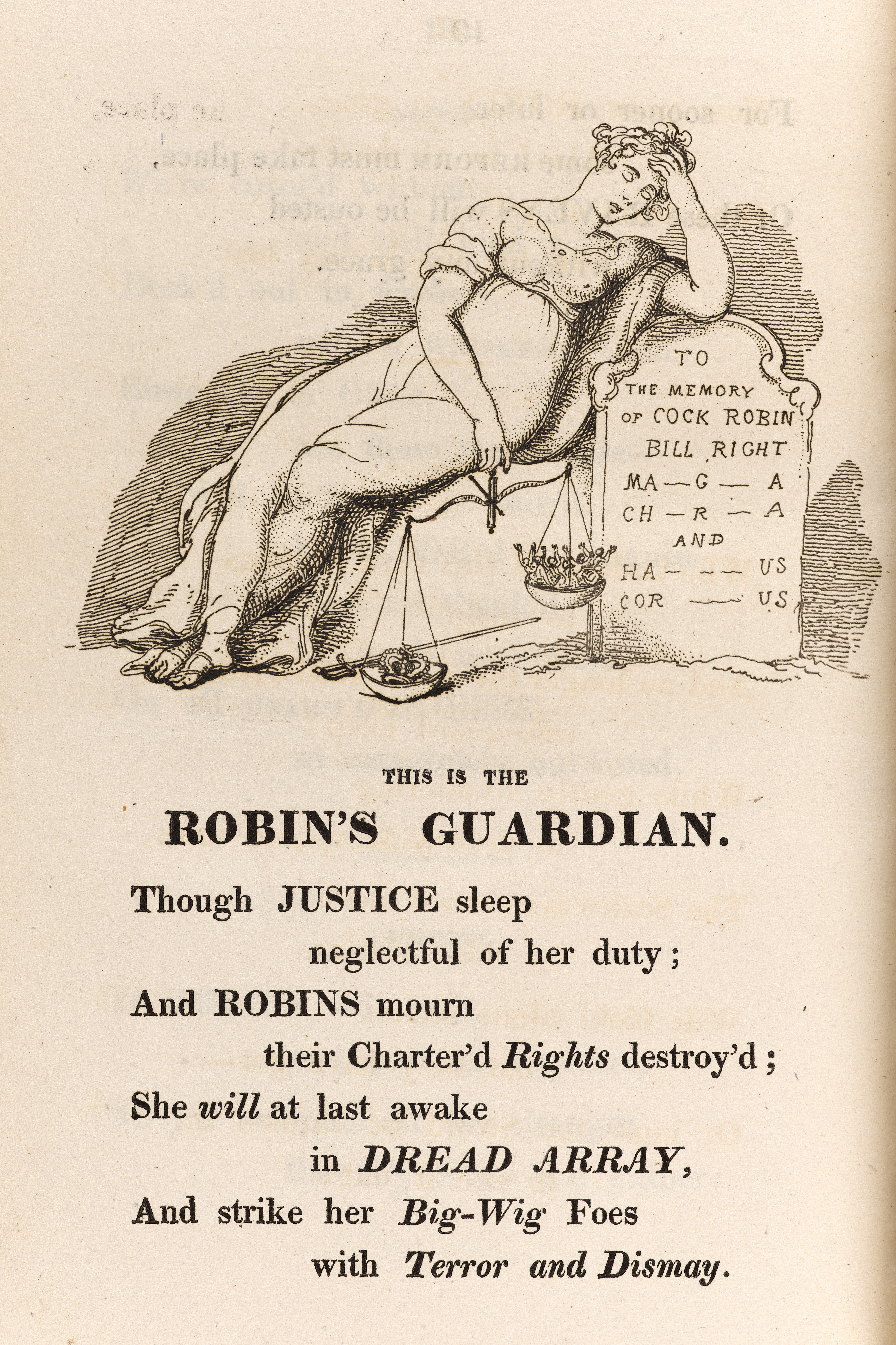 The poem ends, however, with a rallying cry for the ‘robins’ to pull together. In an accompanying image, ‘The Robin’s Guardian’, Lady Justice is shown asleep on the grave of Magna Carta and Habeas Corpus, as the scales of justice favour the Crown over the people. But the ominous tone of the poem is counterbalanced with a message of hope to the people, as the poem tells us, ‘She [Justice] will at last awake / in DREAD ARRAY, / And strike her Big-Wig Foes / with Terror and Dismay.