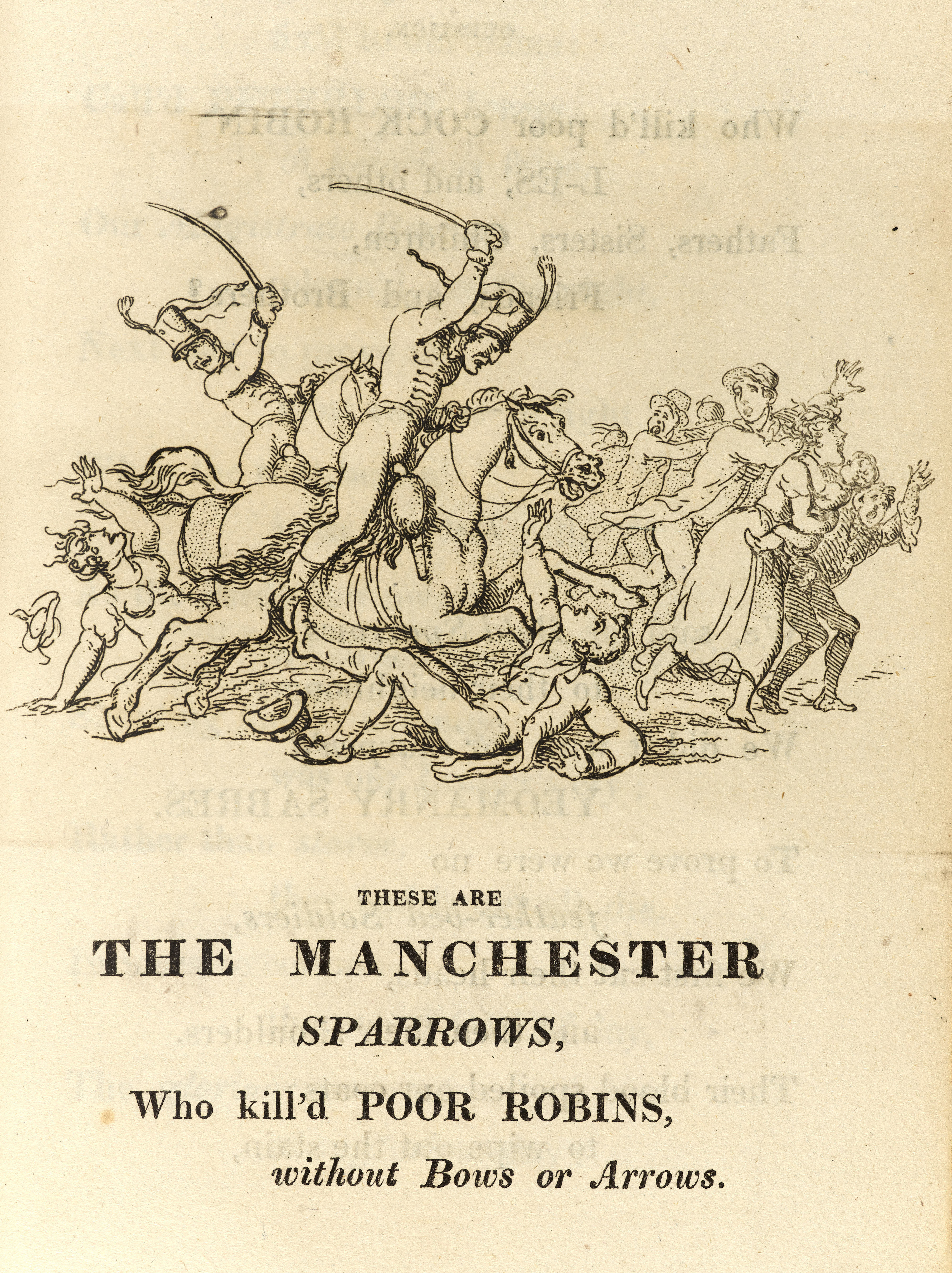 It begins, ‘These are / THE MANCHESTER / SPARROWS, / Who kill’d POOR ROBINS, / Without Bows or Arrows’ with an accompanying image of two soldiers on horses slashing through a crowd. A woman carrying a young child tries to flee. The Robins, in this case, represent the innocent men, women and children who died as a result of the violence in St Peter’s Field on 16th August 1819. The Sparrows represent the armed yeomanry who charged through the crowds.