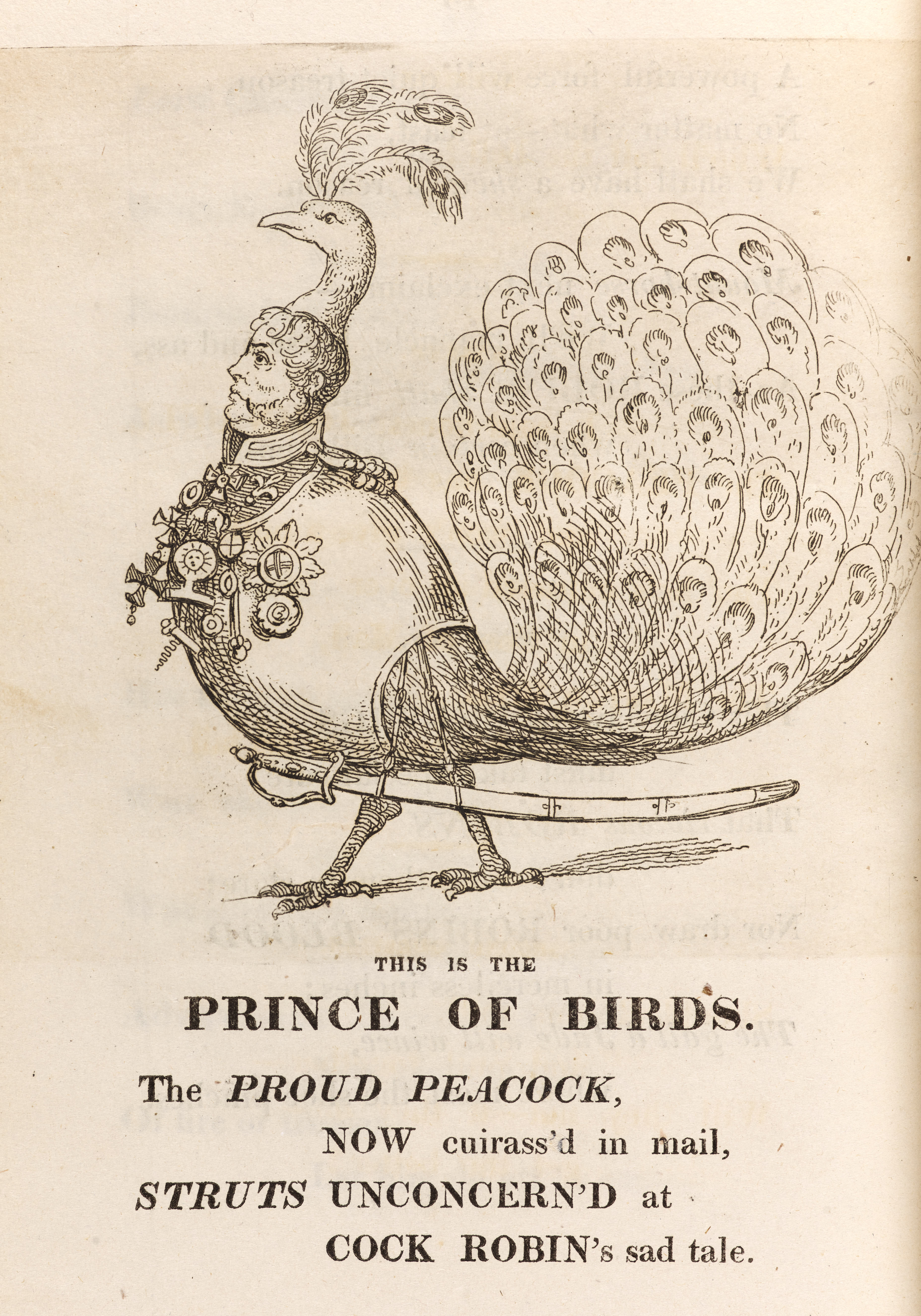 The government was depicted as ‘THE BIG-WIG CREW, / who decided, AT SIGHT, / That SPARROWS might lawfully / kill ROBINS outright.’ The accompanying image depicted major figures in British politics as birds, such as a duck, Lord Quack-mouth (Sidmouth), a hawk, Lord Castle-hawk (Castlereagh) and a rooster, Duke Crow-Well-in-Tune (Wellington).