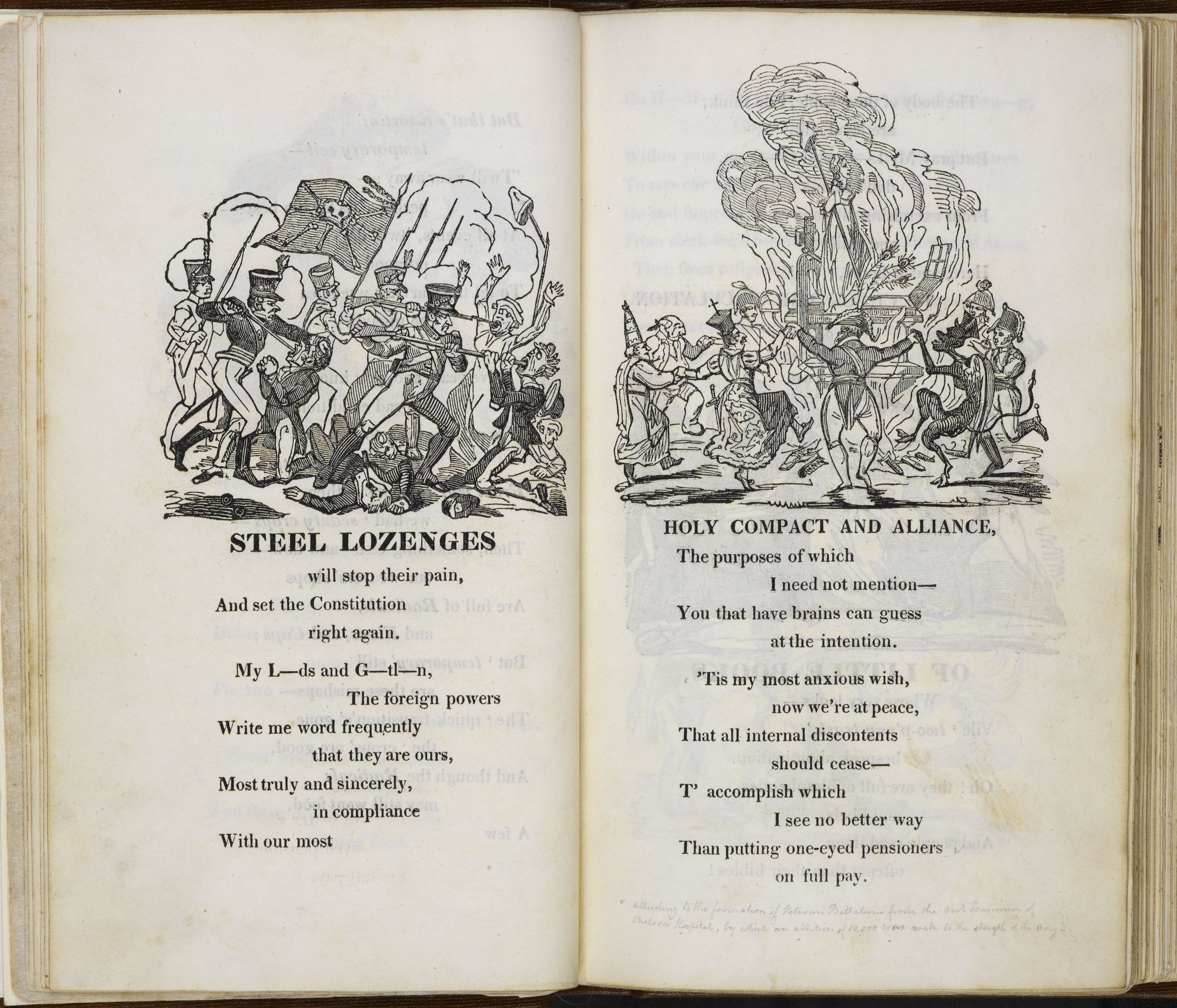 The most striking reference to the Peterloo Massacre is accompanied by an illustration – by George Cruikshank – of armed soldiers stabbing civilians through the mouth with bayonets.