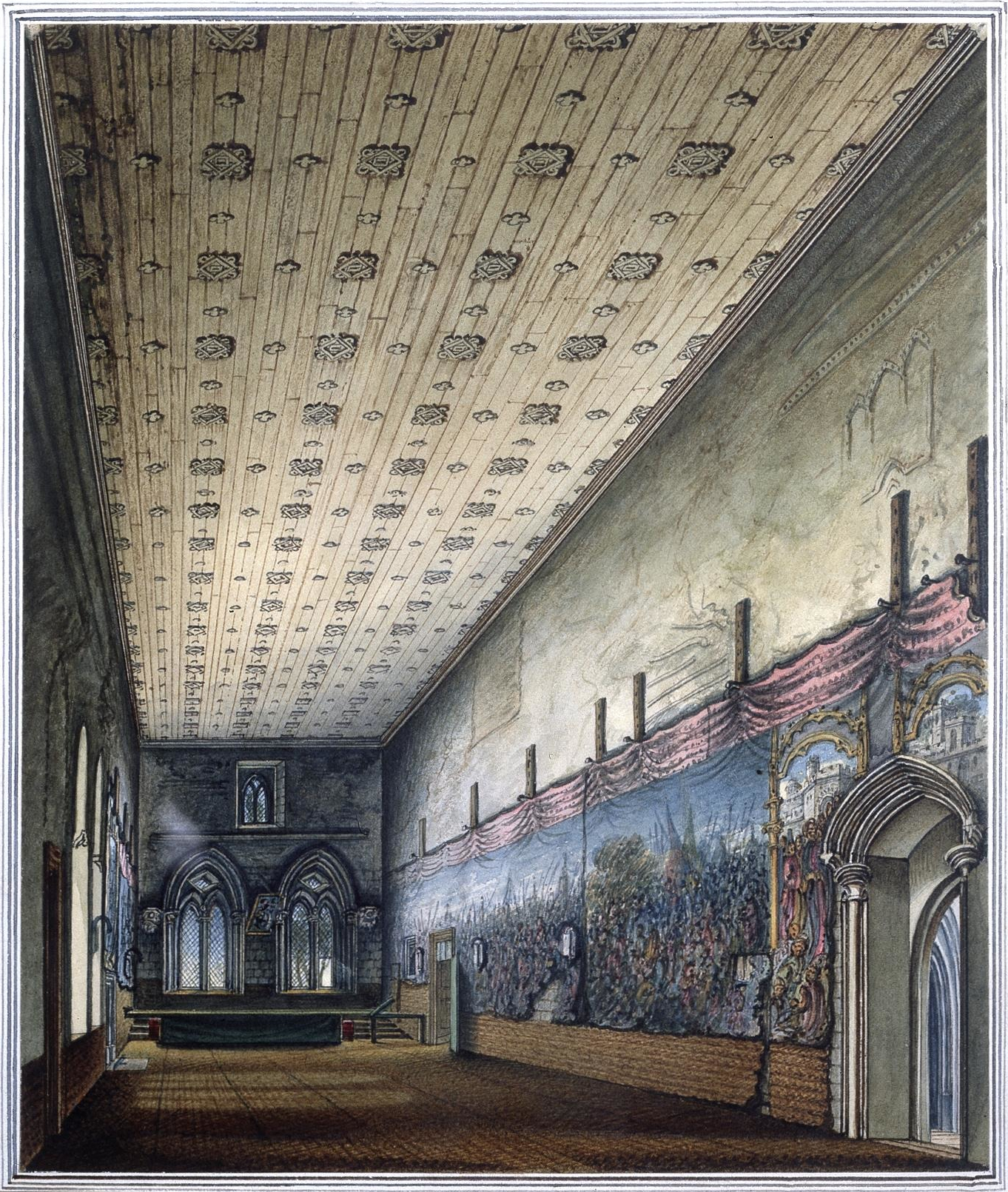In the early seventeenth century, then, the southern end of the old Palace of Westminster, which provided the meeting place for the House of Lords, was given a new lease of life. Before the 1620s the rooms employed by the Lords were seldom used except by Parliament. But thereafter they began to be pressed into service more regularly, first as a makeshift banqueting hall and then as a venue for the newly-created Court of Chivalry, demonstrating that the old Palace of Westminster was nothing if not versatile.