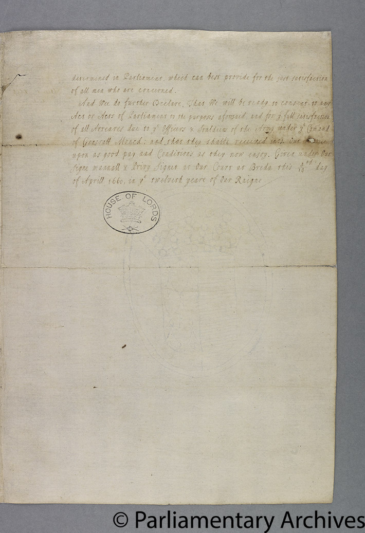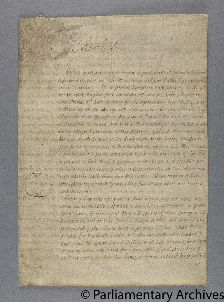 However, another factor was probably the decisive reason for the delay. The king had also sent letters containing his Declaration addressed to the army and the navy. These were forwarded by Parliament on 1 May. It however took until 7 May before the Commons received confirmation from the general-at-sea, Edward Montagu, that the Declaration had been read to the fleet. Only then did arrangements begin for the king to be proclaimed. The proclamation was finalised by the two Houses the following day, enabling it to be read in Palace Yard at Westminster, at Temple Bar and at the Royal Exchange. Crucially, the text of the proclamation made it explicit that, as Charles had been king de jure since his father’s death, this was not the beginning of a new reign, an obvious but very convenient fiction.