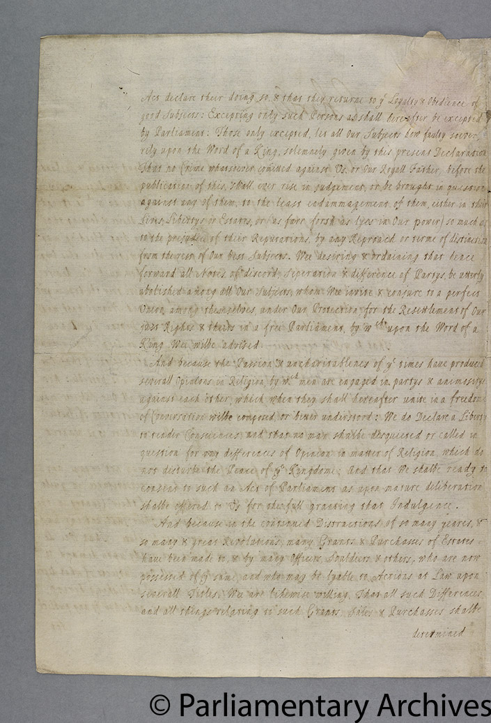 Charles was careful not to overplay his hand. The Declaration of Breda, ostensibly issued from that Dutch town on 4 April, left open some crucial details. Its most famous promise, that any religious settlement would allow ‘liberty for tender consciences’, specifically that ‘no man shall be disquieted or called in question for any differences of opinion in matter of religion which do not disturb the peace of the kingdom’, managed to be as vague as it sounded generous. The final decisions on the extent of  any pardons to be granted and on how to untangle the problem of the confiscated estates were to be left to Parliament. Only his promise to pay the army was completely unambiguous.