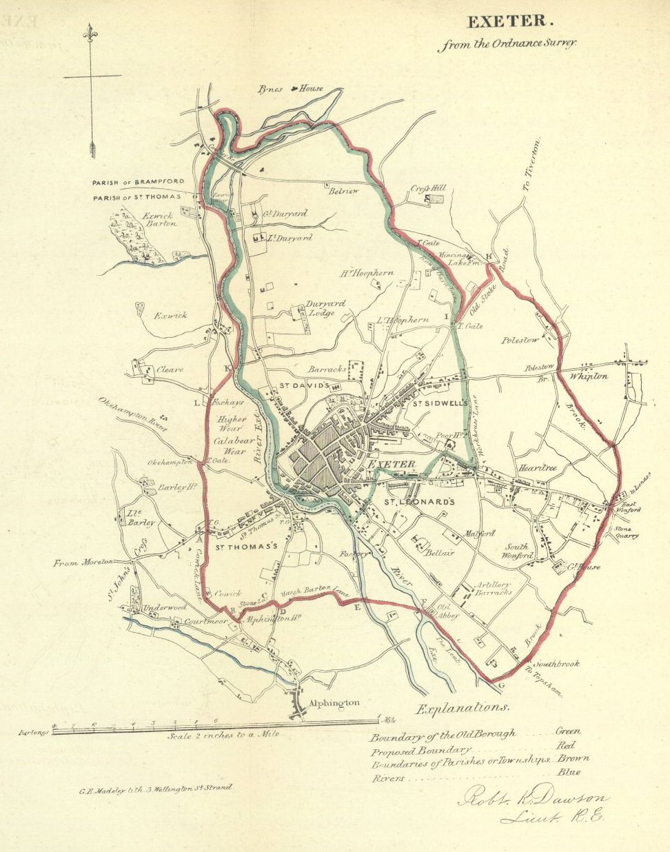 As well as franchise changes, in 1832 Exeter’s boundaries were extended to include the parishes of St Leonard, St Thomas and Heavitree. At the time, these changes were welcomed by Whigs, Reformers and Liberals, and opposed by the forces of Exeter Conservatism, who unsuccessfully petitioned the House of Lords against the ‘great injustice’ of the boundary commissioners’ proposals.
