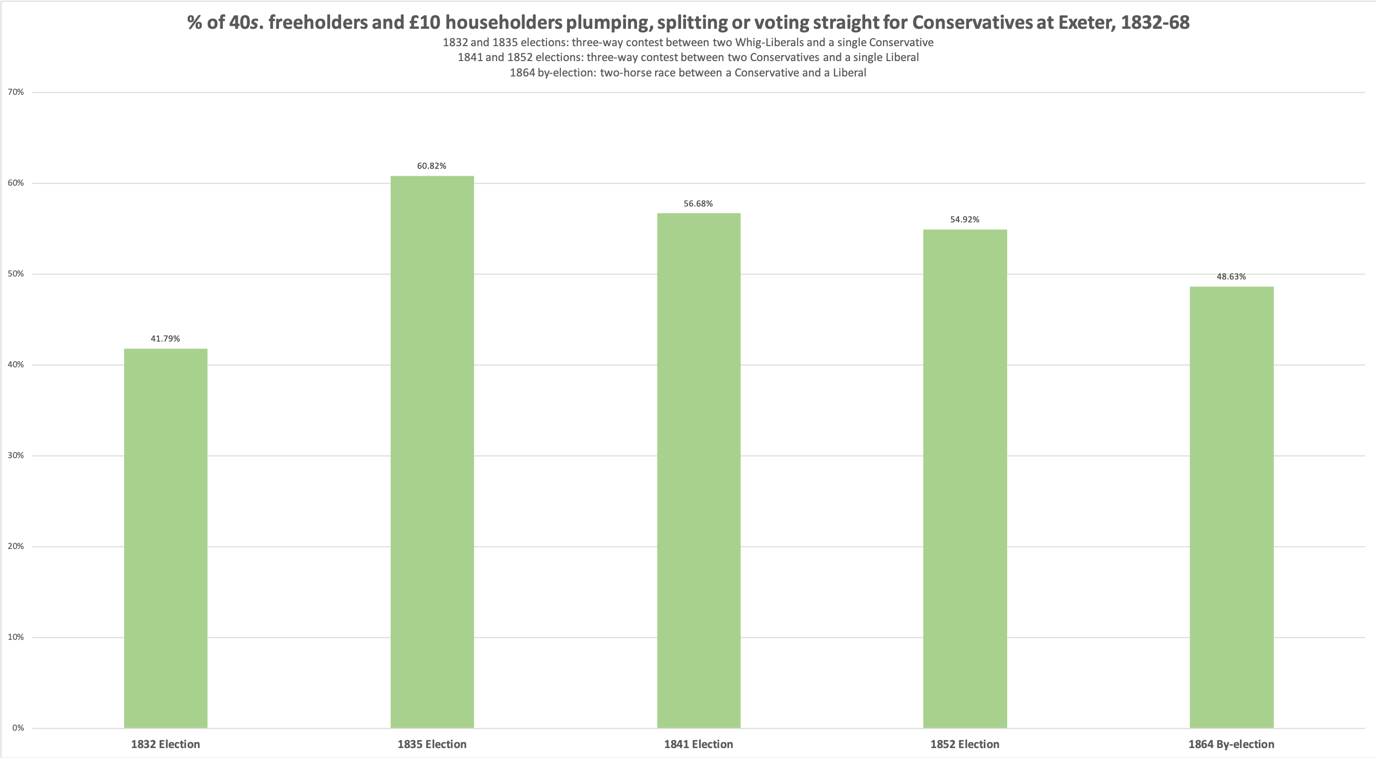 In reality, however, the votes of freemen on their own only swayed one election to the Conservatives between 1832 and 1868 – the 1864 by-election. Exeter’s polling data actually reveals that Conservative candidates enjoyed consistently high levels of support among the more popular freeholder and £10 householder franchises, a majority of whom voted for Conservative candidates at the three-way contests of 1835, 1841 and 1852, whether by splitting with the Liberal candidate or casting a partisan plump or straight votes.