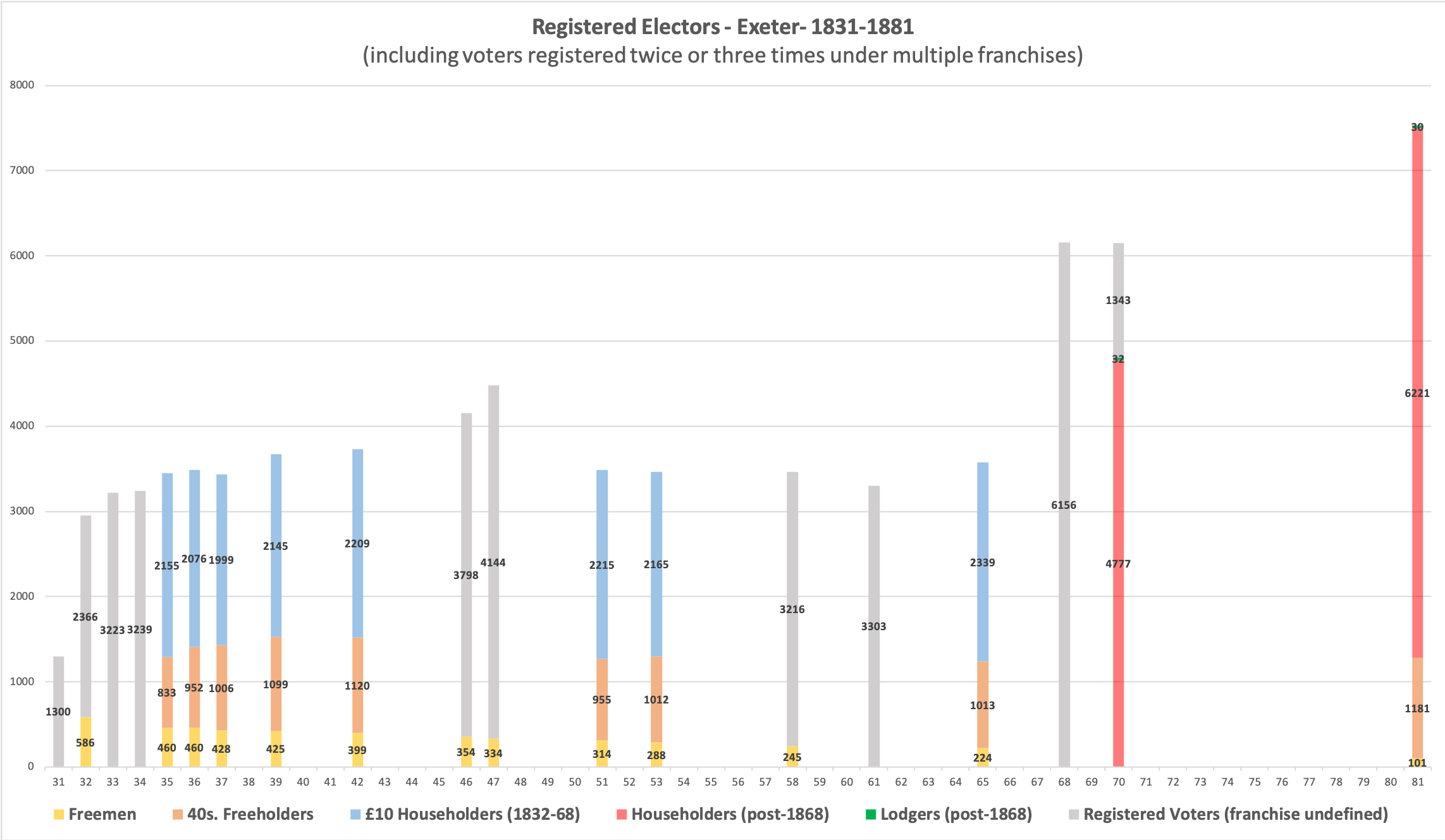 The lack of a 1s. registration fee for this group meant that the freeholder franchise, in particular, continued to grow in popularity after the 1832 Reform Act, and even continued to do so following the 1867 Reform Act. In 1835 833 voters were registered under Exeter’s freeholder qualification, by 1865 that figure had increased to 1013, and by 1881 it had risen to 1181.