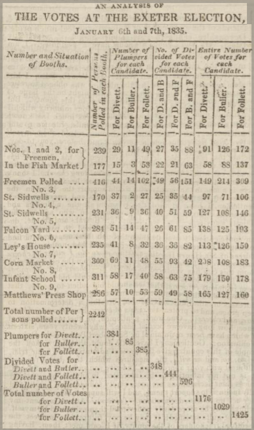 Due to the complex changes to voting rights and extensive boundary reforms that took place in Exeter in 1832, the constituency provides an excellent case study of the unintended consequences of the 1832 Reform Act. As well as revealing the continuation of ‘ancient’ freeman and freeholder voting rights in the reformed electoral system, the constituency offers some stark examples of how, in the long run, the finer details of the 1832 Reform Act actually proved favourable to Conservative candidates.