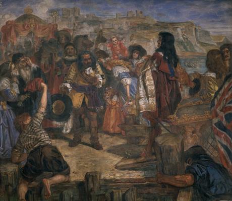 Both Houses had been very busy since inviting the king back. Both had sent delegations to Holland to deliver to him their formal invitations for his return. These parliamentary commissioners did so at The Hague on 16 May. Their colleagues back at Westminster meanwhile made the practical arrangements. Residents in the royal palaces were kicked out and speedy repairs were made to Whitehall. New furnishings were ordered and steps were taken to seize any royal possessions that had been sold off following Charles I’s execution. A new crown (almost certainly the present St Edward’s Crown) was commissioned. The arms of the republic were everywhere replaced with the royal arms and the Scottish standards captured at the battles of Dunbar and Worcester were removed from Westminster Hall. New flags were ordered for the navy.