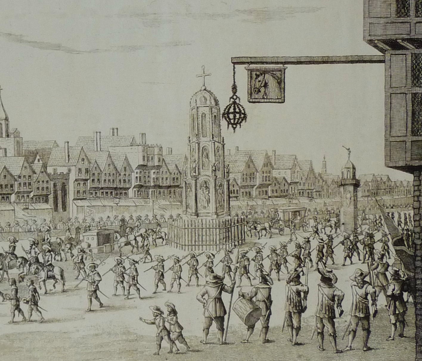 By 1643 Charles I had lost control of London, and the city was a stronghold of puritanism. In March that year, a group of leading godly ministers was appointed to report on residual Catholic imagery in the capital, and inevitably the Cross was singled out for criticism. On 24 April the House of Commons established a committee ‘for the demolition of monuments of superstition and idolatry’. Its chairman, Sir Robert Harley, the only Member to back Jourdain’s complaint in 1626, quickly approached the city authorities, and on 27 April the court of aldermen ordered the dismantling of the Cross. A crowd of several thousand people is said to have watched its destruction in early May, the event being marked by bell-ringing and celebratory bonfires. In keeping with the toxic mix of politics and religion which wrought the downfall of Cheapside Cross, its reviled lead statues were melted down and turned into bullets for the parliamentarian armies.