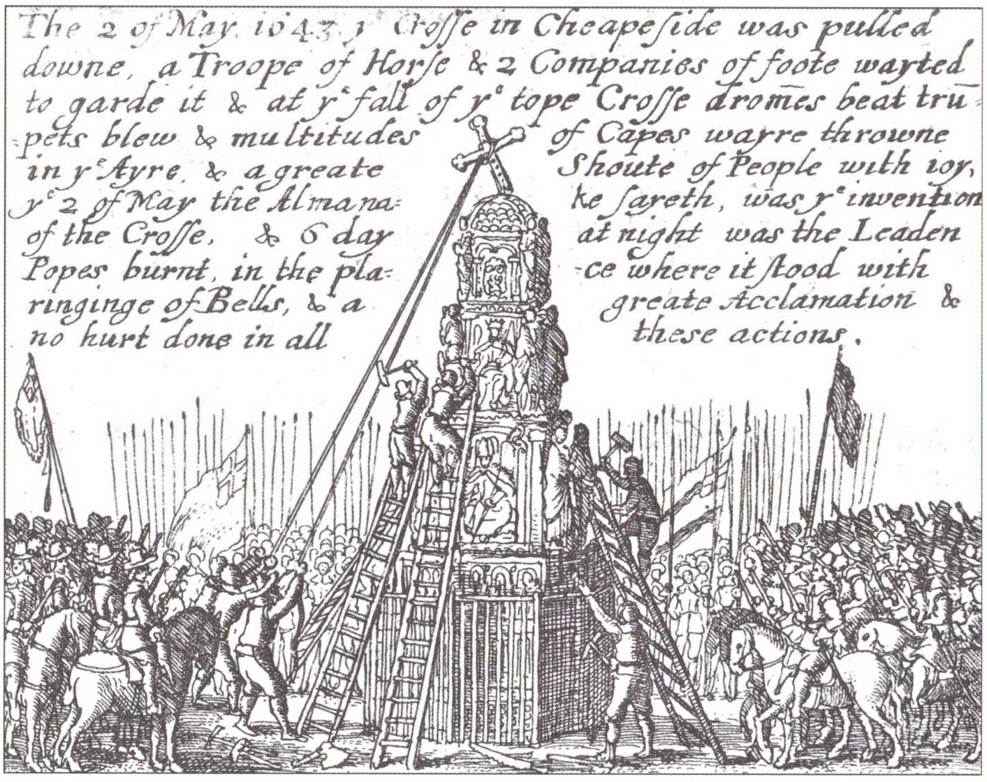 By the 1640s religious divisions in the country had deepened yet further, the liturgical innovations promoted by Archbishop William Laud being widely interpreted as a shift back towards Catholicism. Thus, when England drifted into civil war, Parliament emerged as the champion not just of political reform but of the Protestant cause itself. This left Cheapside Cross extremely vulnerable. Vandalism of its statues resumed, and a vigorous pamphlet war developed between its opponents and supporters, with the monument denounced in ever more virulent terms as a physical obstacle to a truly reformed Church. Tracts such as The Downe-fall of Dagon (1643) even compared the Cross to a pagan idol in the Old Testament destroyed by God’s power.