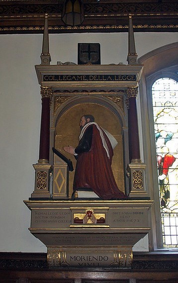 This unexpected statement requires some explanation. Legge was a former master of Caius, who died in 1607. John Gostlin had been one of the college fellows during Legge’s time, working closely with him as dean and bursar, and eventually became master himself in 1619. It was Gostlin who commissioned what was in effect a joint monument, and when he died in 1626 he left instructions that he should be buried in the chapel close to Legge, as suggested by that inscription. Neither man had married, and while that was quite normal for Cambridge fellows at the time, the monument makes it clear that their relationship went some way beyond routine friendship.