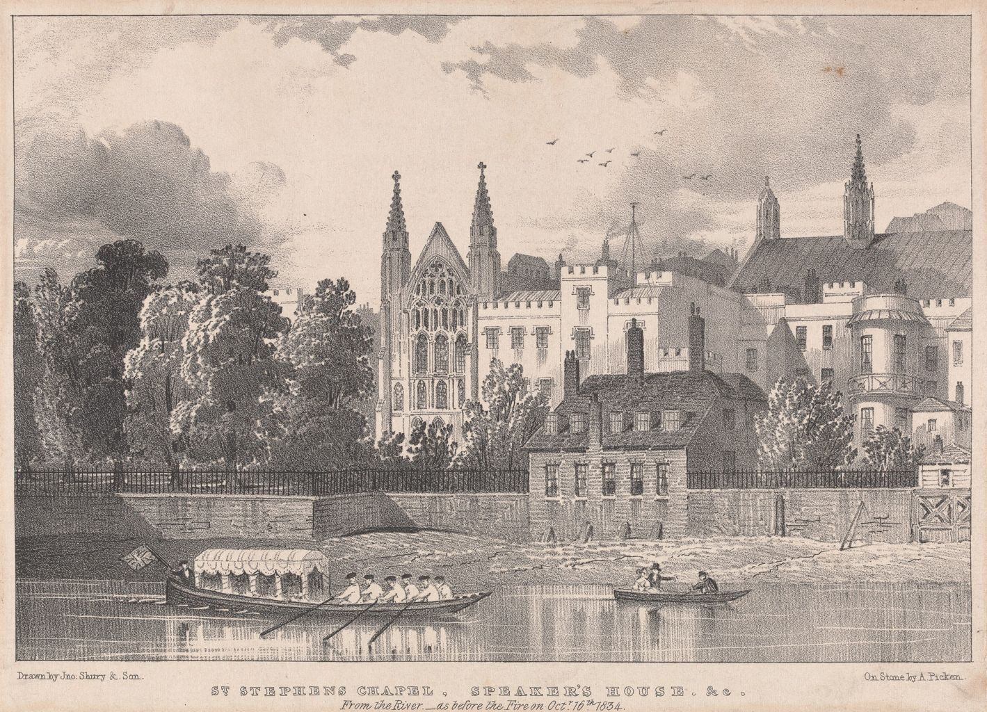 Speaker’s House is the building with crenellations to the right of St Stephen’s Chapel. A. Picken, after J. Shury, ‘St. Stephen’s Chapel, Speaker’s House, & c. From the River as Before the Fire on Oct. 16th 1834’ (c. 1835) CC Yale Center For British Art