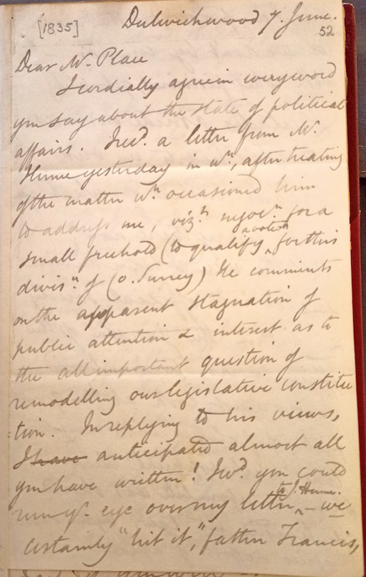 My motive for going up [to London] is the grave importance of this juncture. [George] Grote likes of course to have me at hand when any emergency falls out likely to draw him forth. I carried him up to the best of my power last year [1835], and with effect against the vehement railing of Joseph Parkes, who wanted to muzzle him about the English Municipal Reform Bill!