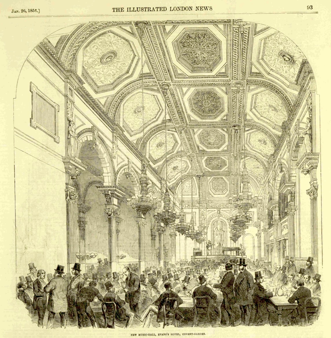 Evans’s was a male-only late night dining room and music hall (with women only admitted to view proceedings from behind a screen and on presentation of their address). Known for its heavy drinking culture and ‘madrigal glees’ sung by ‘well known boys’, it was derided by temperance reformers during the 1860s for ‘vice and profligacy’ and for attracting disreputable gentlemen ‘who had not paid a tailor’s bill for the last seven years’.