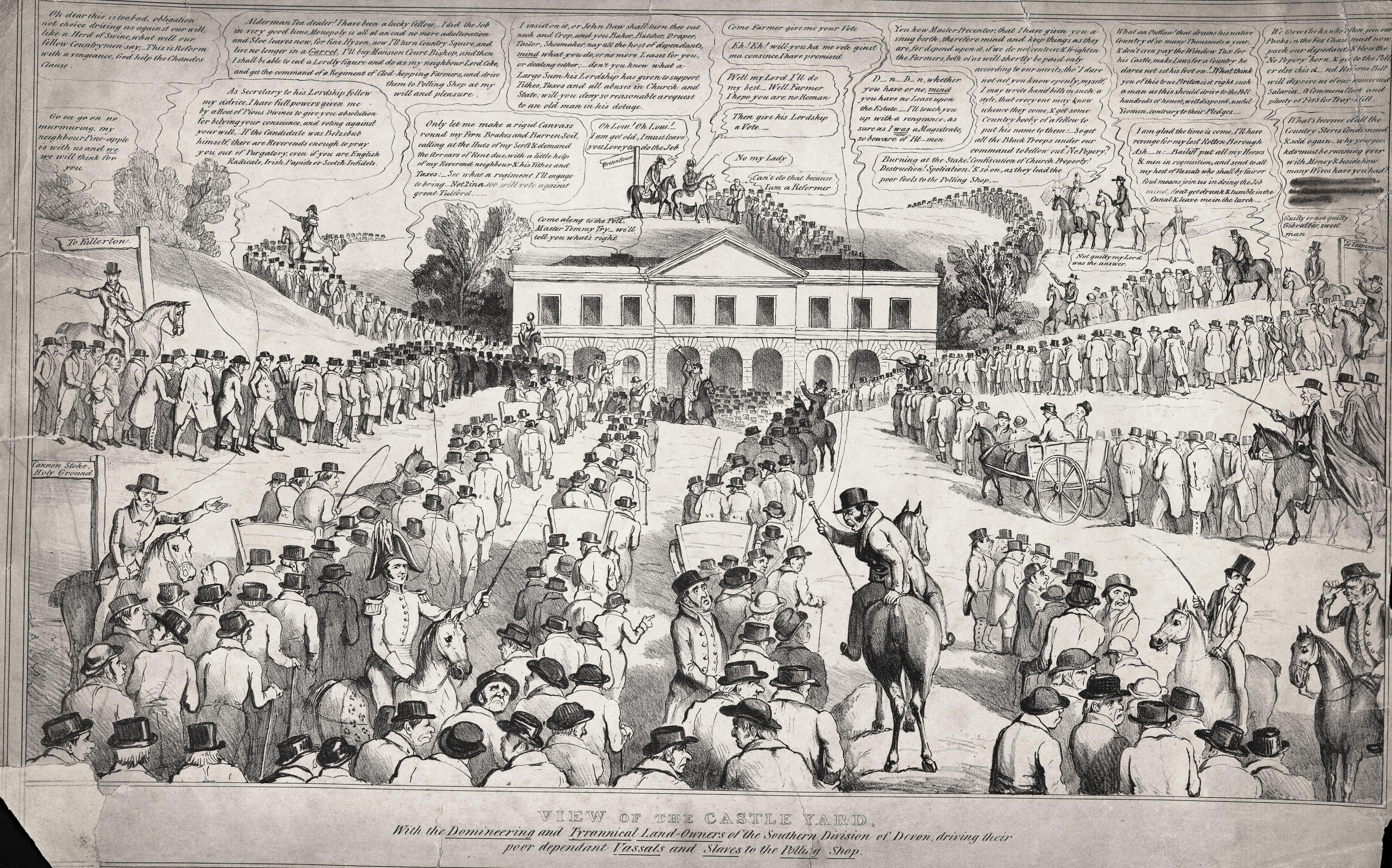 One of the most strikingly resilient interpretations of county politics, put forward by the American sociologist D. C. Moore, has been the idea of ‘deference voting’. Vast numbers of newly enfranchised tenant farmers, Moore argued, overwhelmingly polled the same way as their landlords – willingly or otherwise – as part of ‘deference communities’, effectively bolstering the power of the aristocratic landed elite in Britain’s political system and the influence of traditional landed interests (see cartoon below). The tensions between agriculture and industry that underpinned so many 19th century political developments at Westminster, including of course the famous repeal of the corn laws in 1846, have often been linked back to this reconfiguration of British politics in 1832.